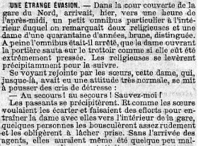 Dans la cour couverte de la gare du Nord, arrivait, hier, vers 1h de l'après-midi, un petit omnibus particulier à l'intérieur duquel on remarque deux religieuses et une dame d'une quarantaine d'années, brune, distinguée. À peine l'omnibus était-il arrêté, que la dame ouvrant la portière sauta sur le trottoir comme si elle eût été expressément pressée. Les religieuses se levèrent précipitamment pour la suivre.